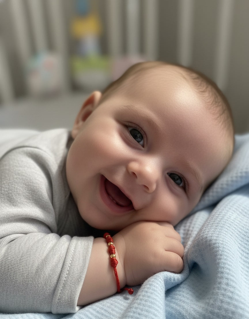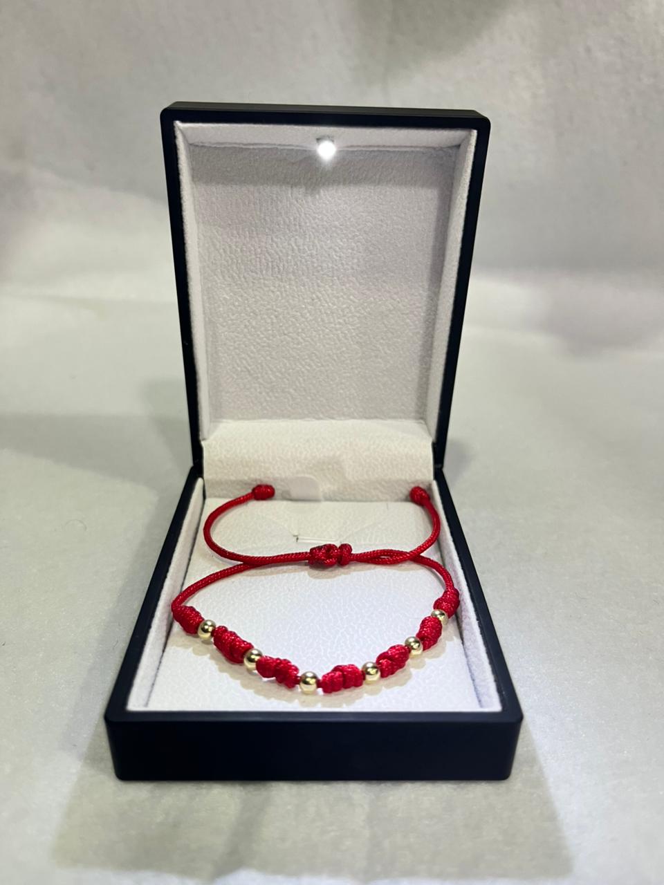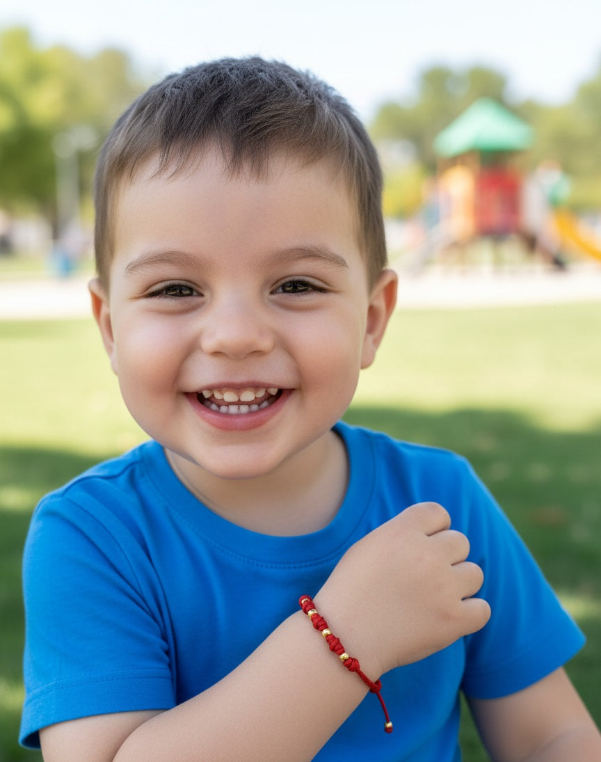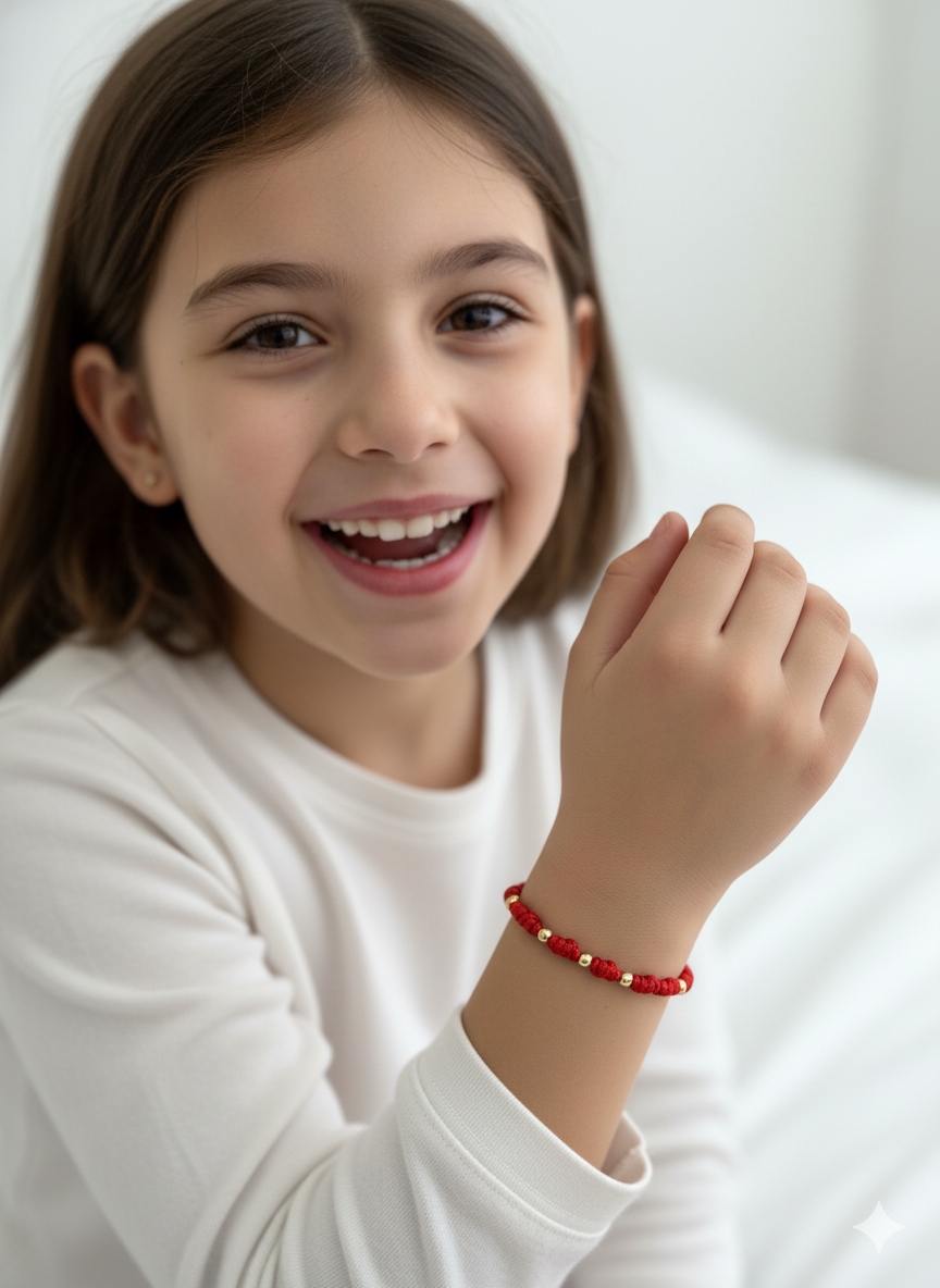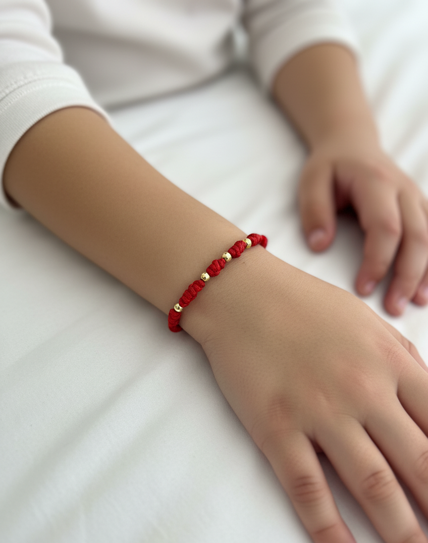 Cada uno de los 7 nudos representa una barrera que protege cuerpo y espíritu, el hilo rojo, inspirado en la tradición cabalística, atrae buena suerte y aleja las malas energías. Esta versión para bebés y niños usa materiales suaves y seguros para llevar todo el día., los balines en oro laminado 18K aportan brillo, energía y elegancia. Más que un amuleto, es tranquilidad para quien protege lo que más ama.